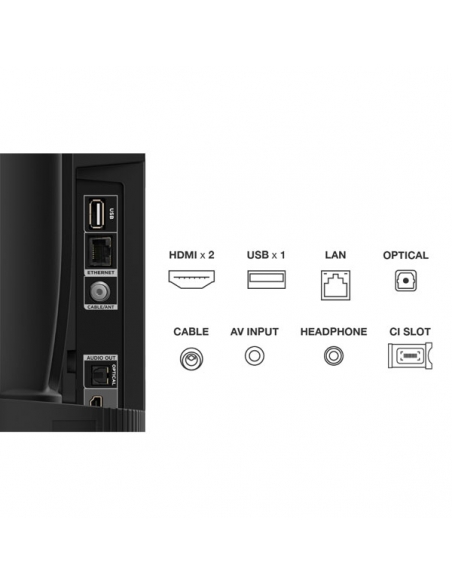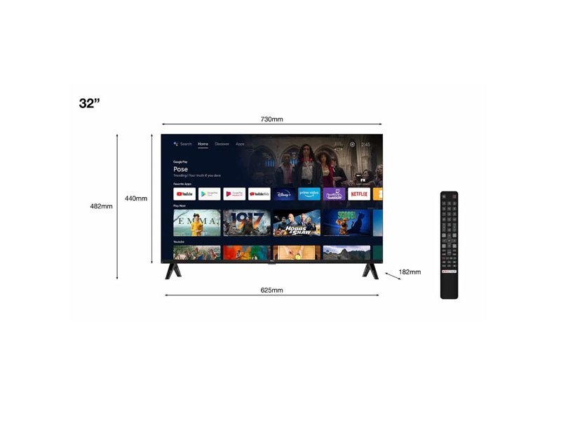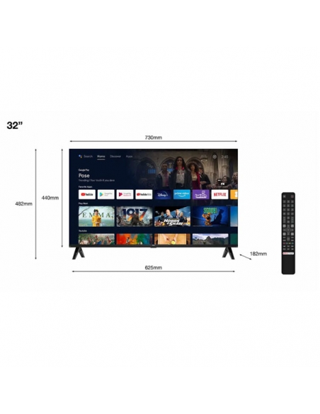 Tv Led, 32", Hdr, Android Tv, Wi-fi, Resolución de la pantalla: 1366 x 768, Potencia estimada RMS:10, Smart TV, Versión Android: Android R (11.0), Formato de señal digitalDVB-C, DVB-S2, DVB-T2, Dimensiones (con soporte) (AnchoxFondoxAlto): 716x180x467.